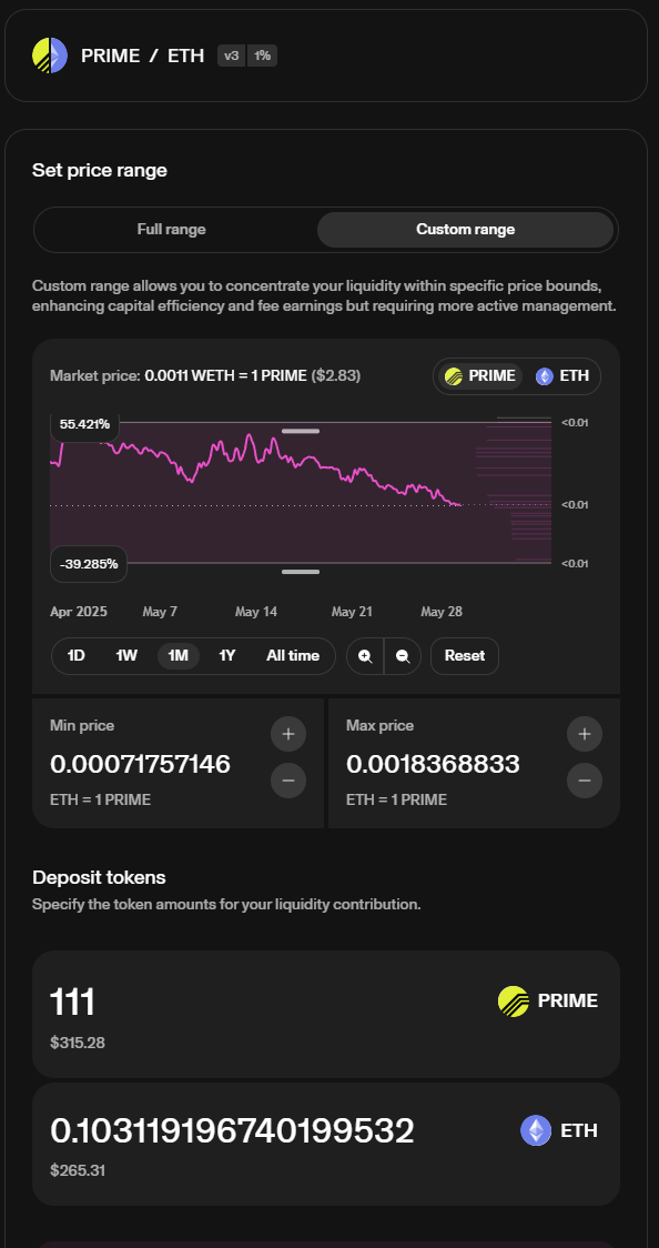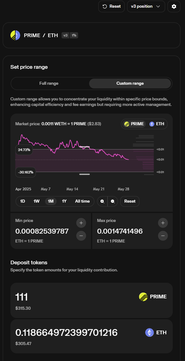 The following is a valid position. The ratio is around 49% ($305 in Eth and $315 in PRIME) and the width is 54.892% (24.73 + 30.162).